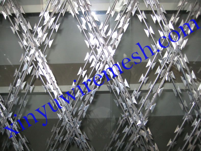 直線型刀片刺繩,是把刀片刺絲焊接成菱形孔或者方形孔的刀片刺網(wǎng),如果想攀爬翻越,網(wǎng)狀的刀片刺網(wǎng)刀片鋒利,手不能握,腳不能攀登,堅決阻止人逾越的防護墻,具有很強的恐嚇和阻止效果,既美觀又實際效果顯著. 深受監(jiān)獄、軍隊、政府設施的喜好。